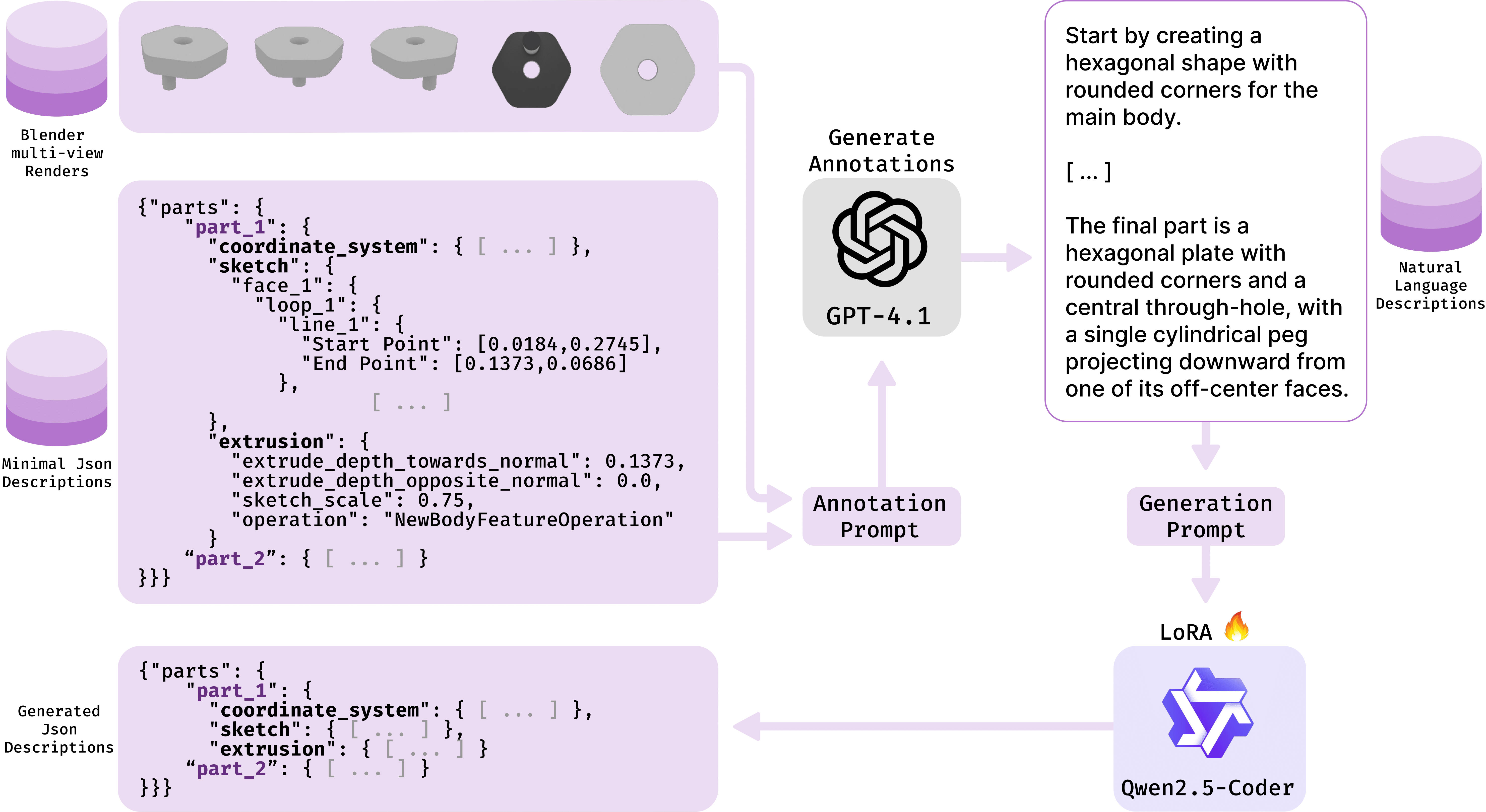 With Ansys, we developed CADmium, a new open-source dataset consisting of natural language descriptions for 170k+ 3D CAD objects. We propose a novel LLM fine-tuning workflow with code LLMs, and augment existing evaluation schemes with new metrics.